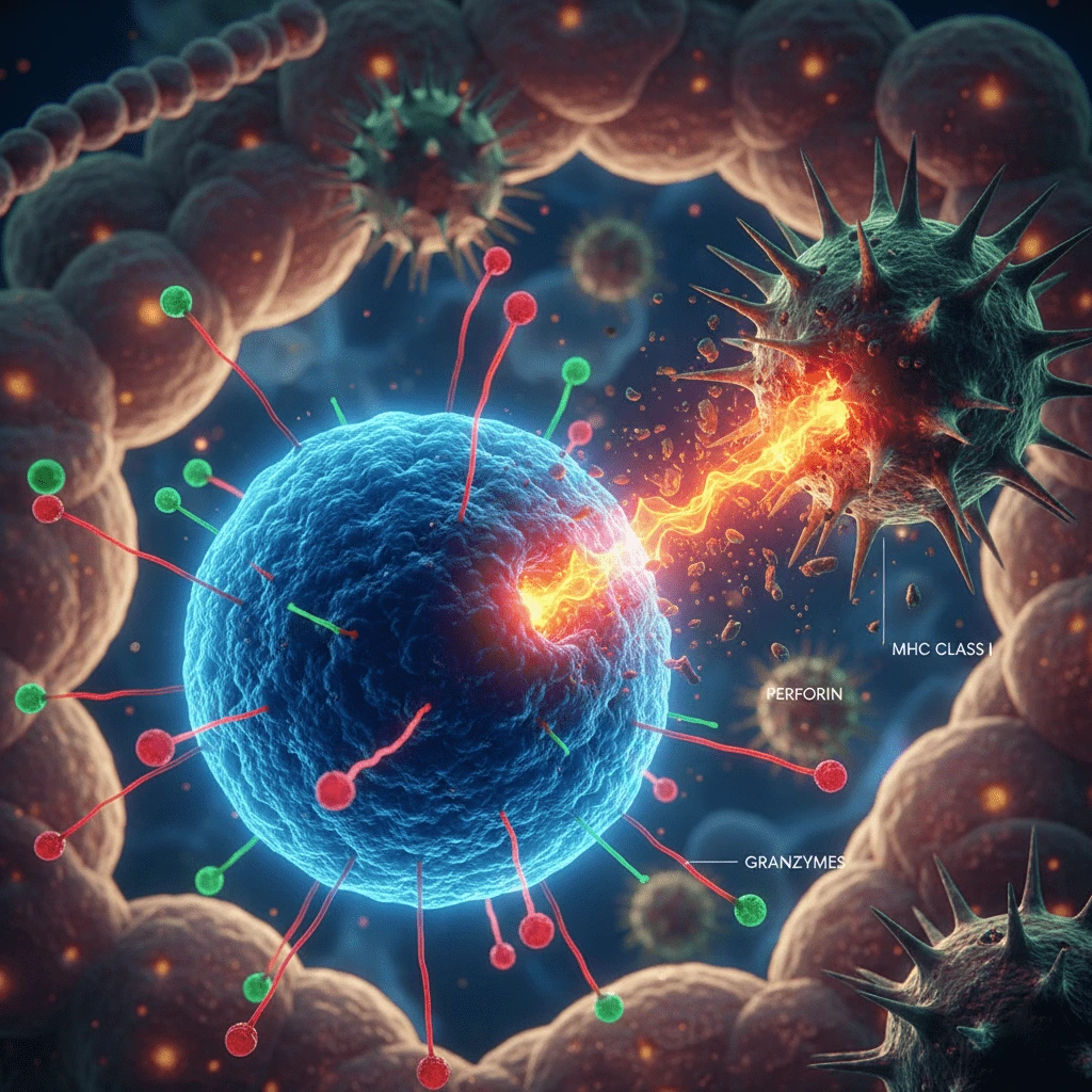 Bayangkan tubuh Anda adalah sebuah kota yang sangat aman. NK Cell adalah seperti Pasukan Khusus atau Polisi Patroli yang bertugas menjaga kota tersebut dari penyusup berbahaya, seperti virus atau sel-sel jahat (kanker).